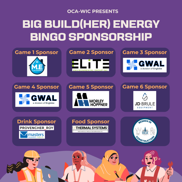 Enjoy refreshments while networking with Ottawa’s women in construction, hear remarks from OCA-WIC Committee Chair Tracy O'Brien, and get ready to call out “Bingo!” for your chance to win exciting prizes.